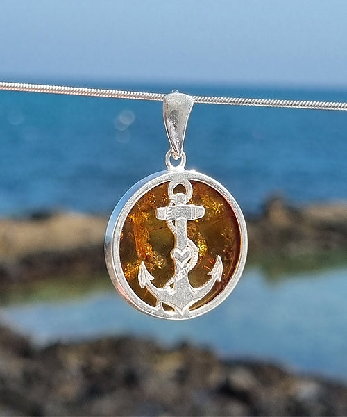 Präsentiere den wunderschönen Bernsteinanhänger mit Ankersymbol, der Stil und Symbolik vereint.
