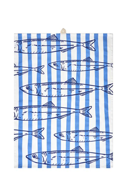 - Das Geschirrtuch zeigt den gestreiften Druck eines Fischschwarms der perfekt das maritime Thema einfängt. Die Farbgestaltung in schönen Blautönen sorgt für einen frischen und klassischen Look, der in jeder Küche gut zur Geltung kommt.
