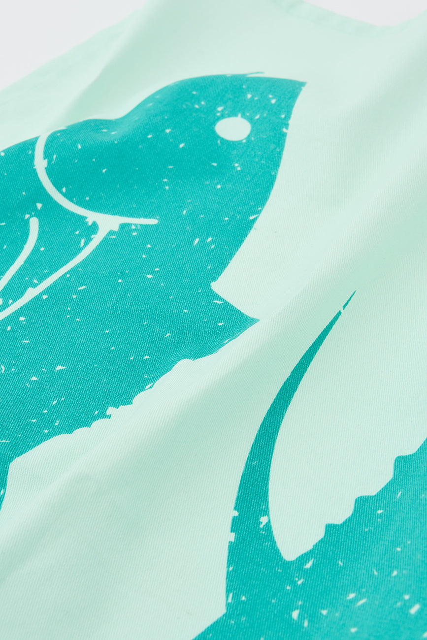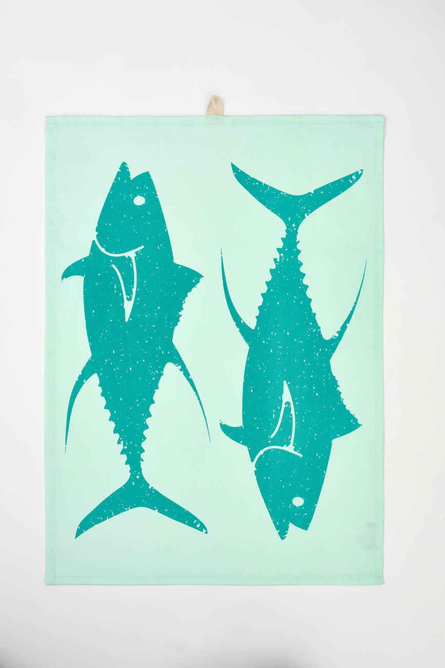 - Das Geschirrtuch zeigt einen beeindruckenden Druck von zwei Gelbflossentunfischen, die das maritime Thema auf elegante Weise einfangen. Die harmonische Farbgestaltung in Hellgrün und Grün bringt Frische und Lebendigkeit in deine Küche.